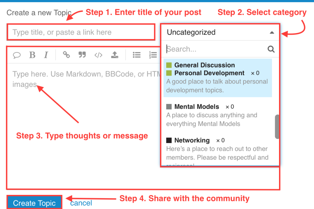 The rest is pretty straight forward. A box like the one below will pop up. Just fill it out! Make sure you select the appropriate category (Step 2) or your post will go to no man’s land and won’t get much engagement.