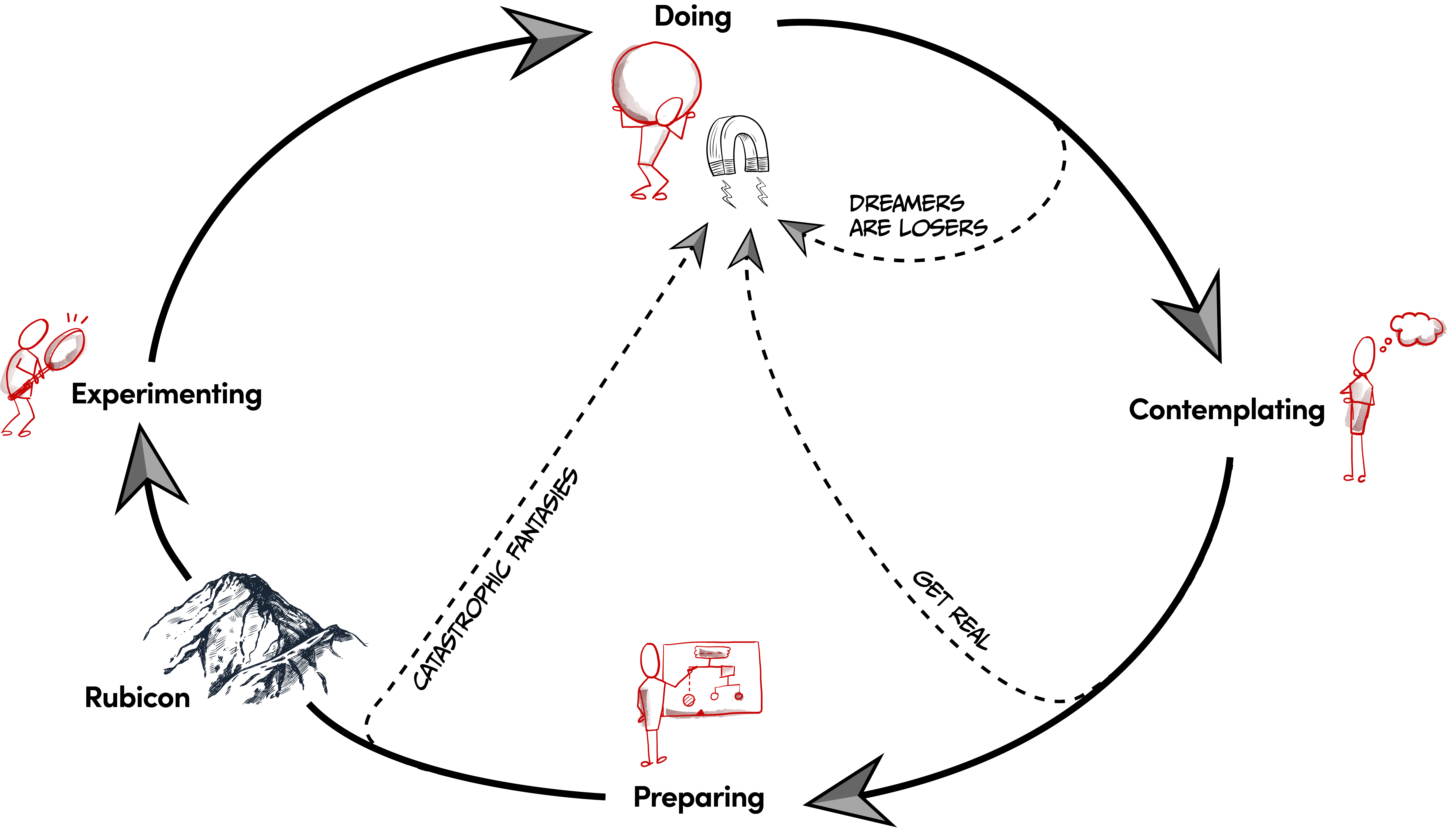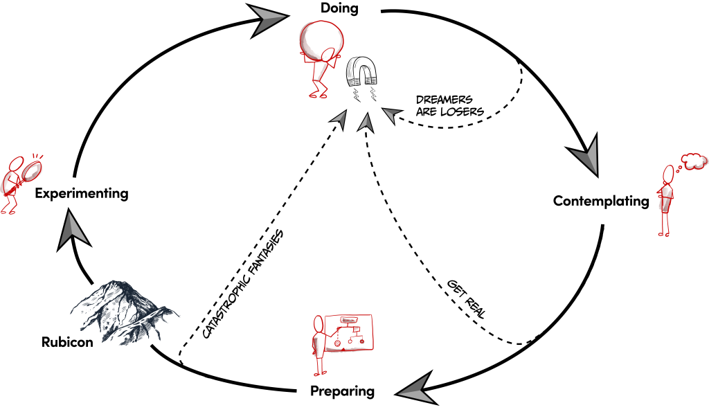 We all go through psychological steps when we make big decisions. Some people call this the “existential cycle,” which really has four stages: doing, contemplating, preparing, and experimenting.